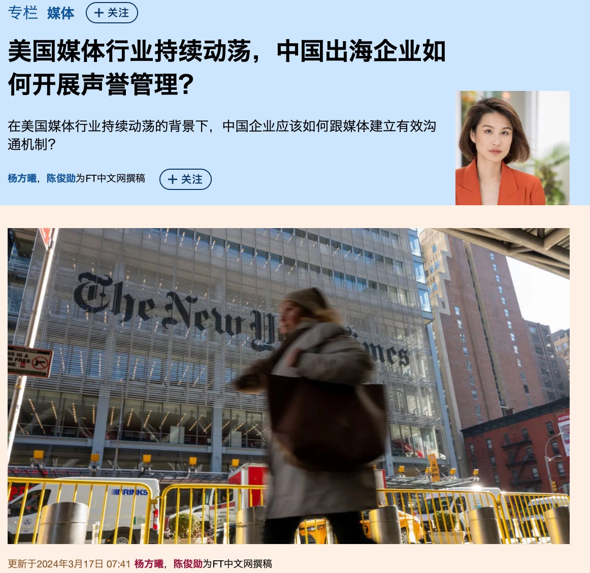 and originally appeared in FT Chinese and cross-posted in .With the media industry facing significant changes and ongoing U.S.-China geopolitical tensions, strategic PR and reputation management have become increasingly important for Chinese companies aiming for overseas markets. This piece offers some perspectives on the current state of Chinese companies' reputation management and recommended strategies for navigating these challenges and enhancing brand influence in international markets