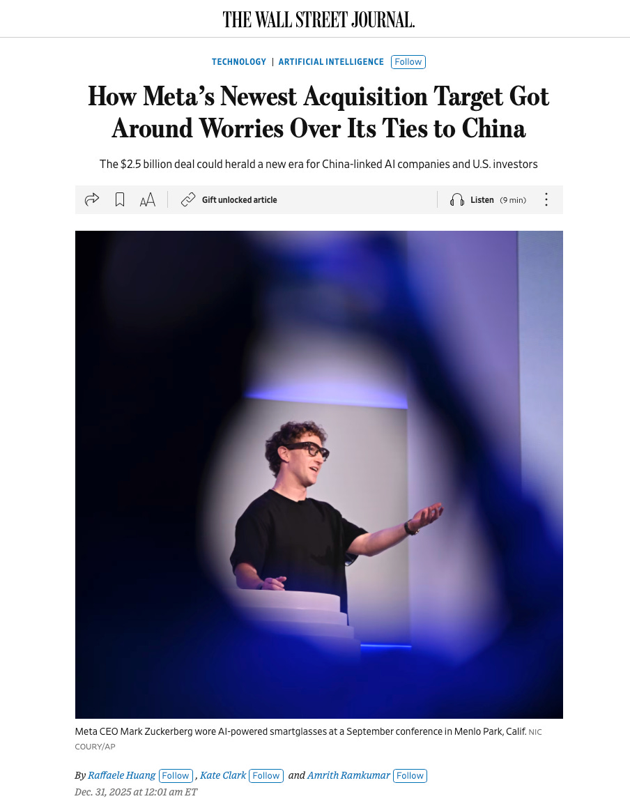 Meta changes the story because it changes the end state. In the Benchmark case, the headline was “American capital flowing into a China-connected AI company.” In an acquisition with a clean cut with China, the headline becomes “a China-origin capability being pulled into U.S. ownership and control.”