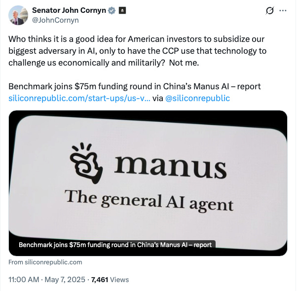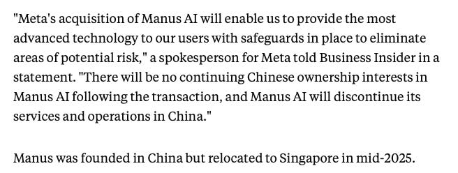 Meta executed the messaging with almost surgical precision, and Manus checked off many boxes in advance by moving to Singapore. Meta left little room for ambiguity, and DC China hawks have not mounted a sustained objection since the announcement.