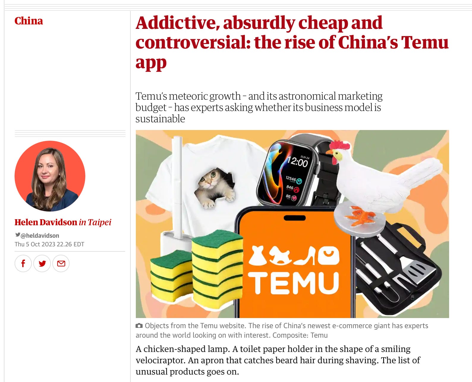 ’s Helen Davidson reached out to me for a Temu story she’s writing. (The full piece is live now, and you can read it here!) In the same week, I was invited to participate in a one-hour panel discussion about cross-border commerce on Pheonix TV and contribute to an upcoming story in the Rest of the World. And in thinking about what I wanted to say, I went down the rabbit hole on all things on cross border e-commerce, and came out of these experiences thinking more about “PR best practices.”Temu’s PR dao of non-action 无为而治